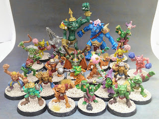 These are all 2nd edition Goblins, painted in 3 main colours. Red for 'Lava', Green for 'Forest', then Blue for the 'Sea'. I figured different types would come together to play. The other positions are from 3rd Edition models and a Warhammer Doom Diver. They also have some Goblin Cheerleaders who have their nipples out. Then its the 1999 Chaos Troll, along with Ripper you'd have seen in the Orc team. He doesn't care who he plays for, as long as they pay.
